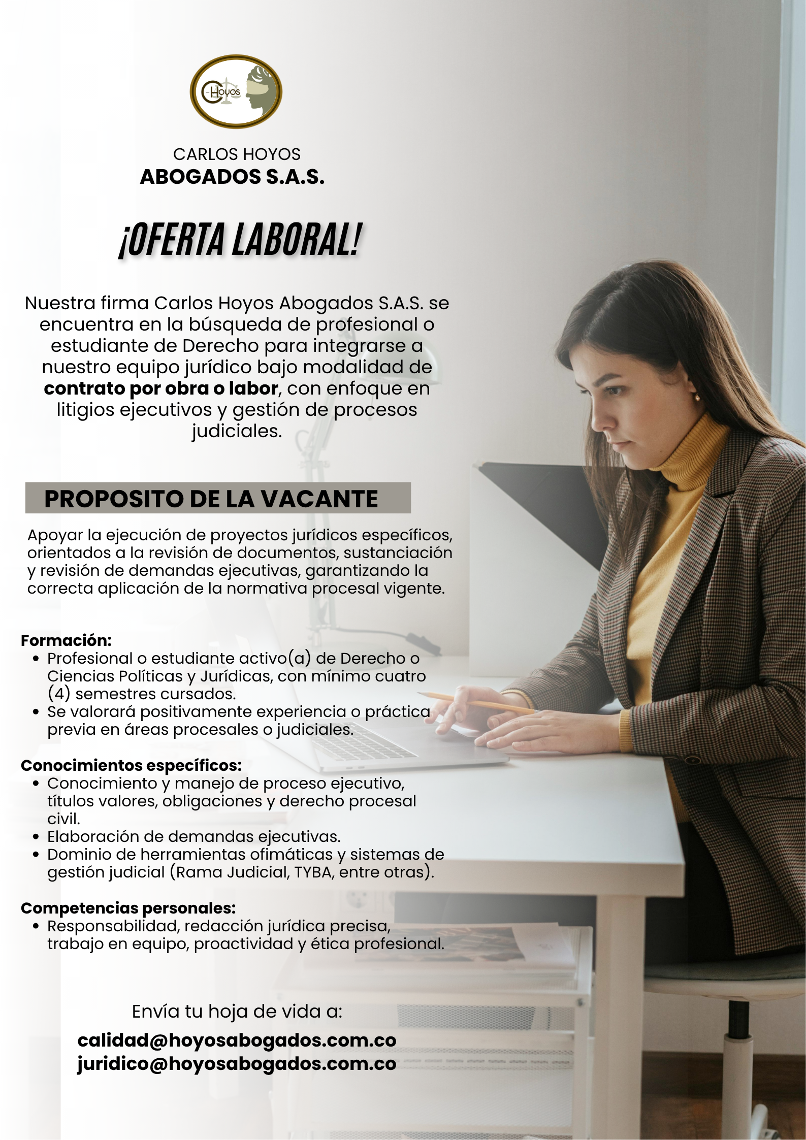 En CARLOS HOYOS ABOGADOS S.A.S, somos líderes en gestión de cobro de cartera, comprometidos con brindar soluciones efectivas y personalizadas a nuestros clientes. Buscamos personas apasionadas, responsables y con ganas de crecer profesionalmente.